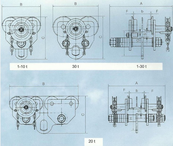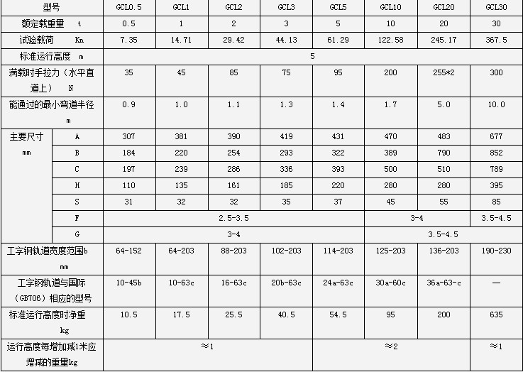 手鏈單軌小車GCL型0.5T-30T介紹: 手鏈單軌小車又叫手拉葫蘆跑車,廣泛用于無電源的工作環境下,汽車發動機的安裝就位和貨物的搬運。