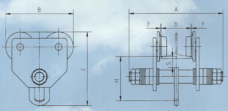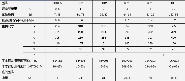 手推單軌小車GCT型0.5T-10T: GCT型手推單軌小車工作安全,維護簡易,結構緊湊,安裝尺寸小,車輪輪緣間距可按軌道寬度要求簡易調(diào)整,使用方便,車輪車輪經(jīng)過特殊設計形狀的踏面,使其能在1:6及以下的斜軌道或平軌面上行駛。