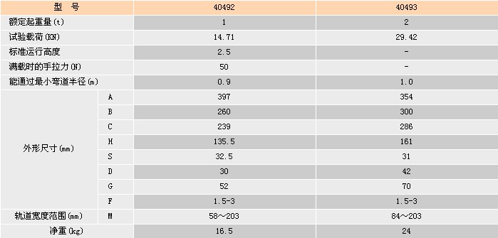 浙江手牌40492/40493型手推/手鏈單軌小車技術參數: