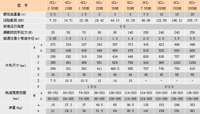 浙江手牌GCL-SHK型手推/手鏈單軌小車技術參數: