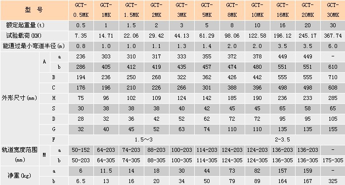 浙江手牌 GCT-MK型手推/手鏈單軌小車技術參數: