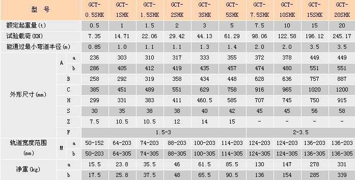 浙江手牌GCT-SHK型手推/手鏈單軌小車技術參數: