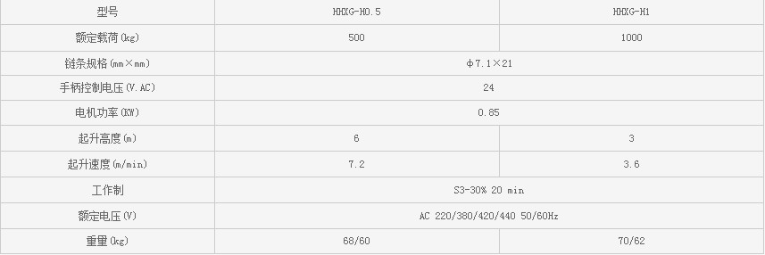 浙江凱勛HHXG-H0.5--HHXG-H1環(huán)鏈電動(dòng)葫蘆技術(shù)參數(shù):