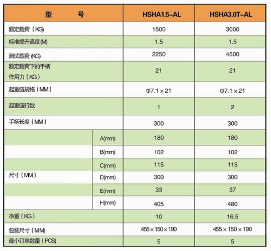 上海滬力鋁合金手扳葫蘆系列技術參數: