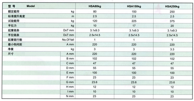 上海滬力輕型手拉葫蘆技術(shù)參數(shù):