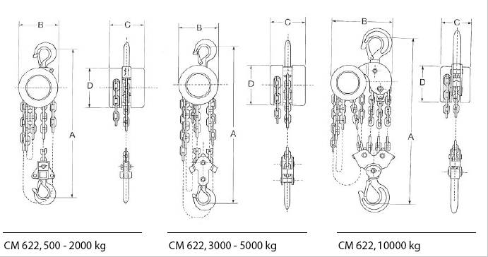 美國科美CM622型手拉環鏈葫蘆外形尺寸: