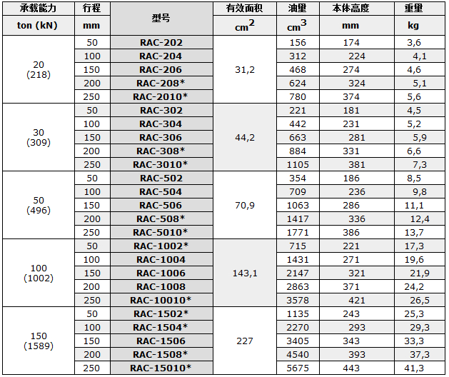 恩派克RAC系列單作用鋁制油缸參數: